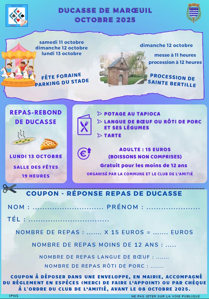 La commune de Maroeuil et le Club de l’amitié vous invitent à partager un moment convivial lors du Repas-Rebond de la Ducasse ! Ce repas est l'occasion parfaite de prolonger les festivités de la ducasse et de passer une soirée chaleureuse entre habitants.