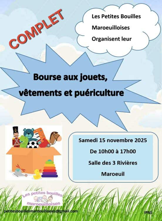 L'association "Les Petites Bouilles Maroeuilloises" organise leur bourse aux jouets, vêtements et puériculture, le samedi 15 novembre 2025 de 10h à 17h, à l'Espace des 3 rivières.