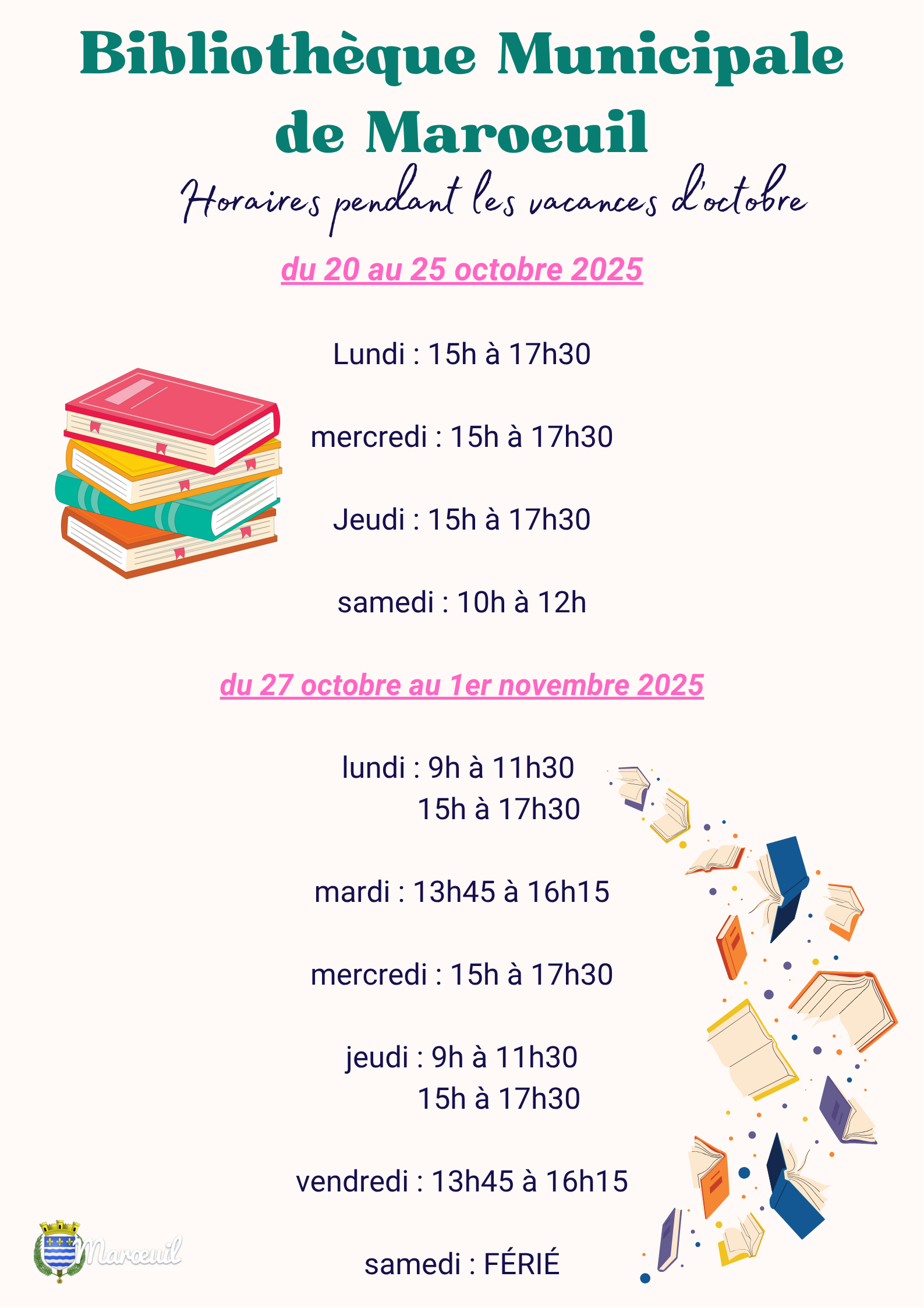 Horaires de la bibliothèque municipale pendant les vacances d'octobre Bonne lecture à toutes et à tous